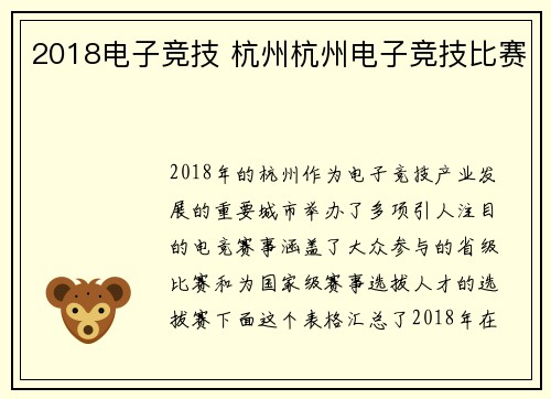 2018年的杭州,作为电子竞技产业发展的重要城市,举办了多项引人注目的电竞赛事,涵盖了大众参与的省级比赛和为国家级赛事选拔人才的选拔赛。 下面这个表格汇总了2018年在杭州举行的主要电子竞技赛事信息,方便你快速了解: | 赛事名称 | 举办时间 | 举办地点 | 主要项目 | 冠军队伍/选手 | |...